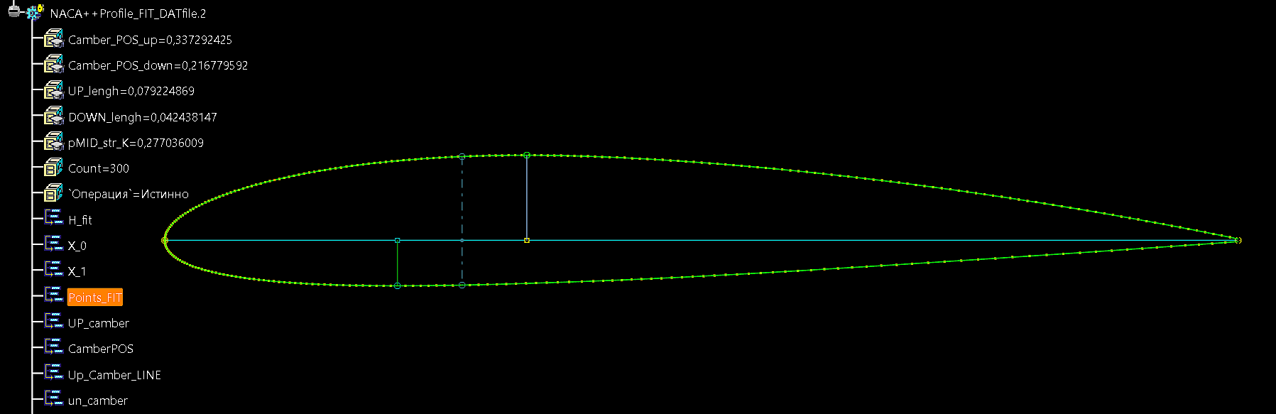 7. По построенному и вписанному профилю находятся и строятся его экстремумы, их проекции на хорду, высоты и строительная высота. И в виде графических фич, и в виде параметров в дереве - легко анализировать параметры профиля