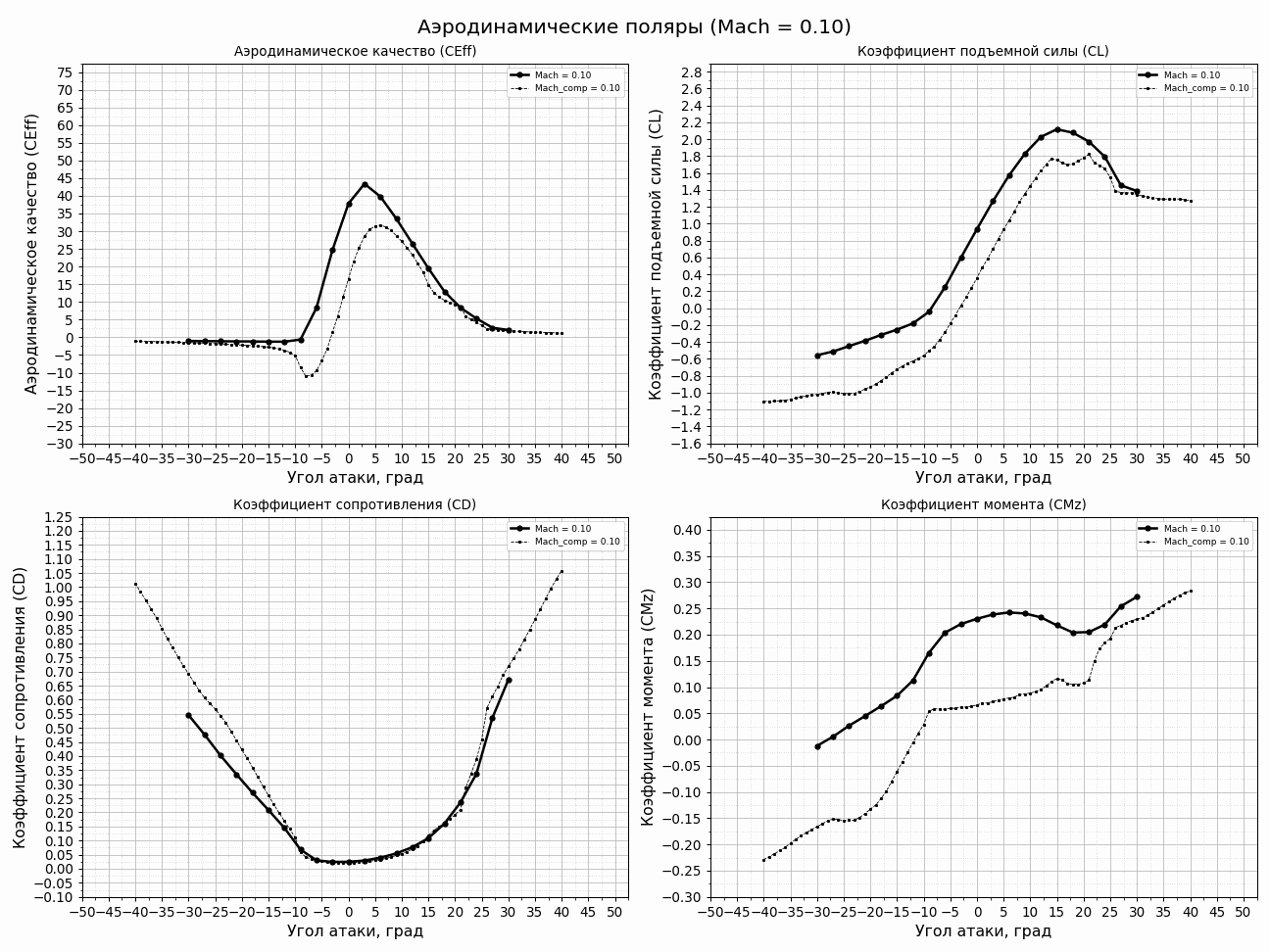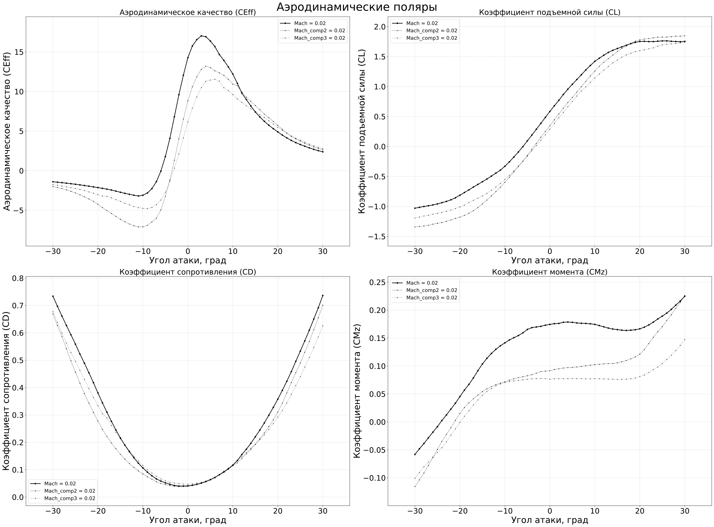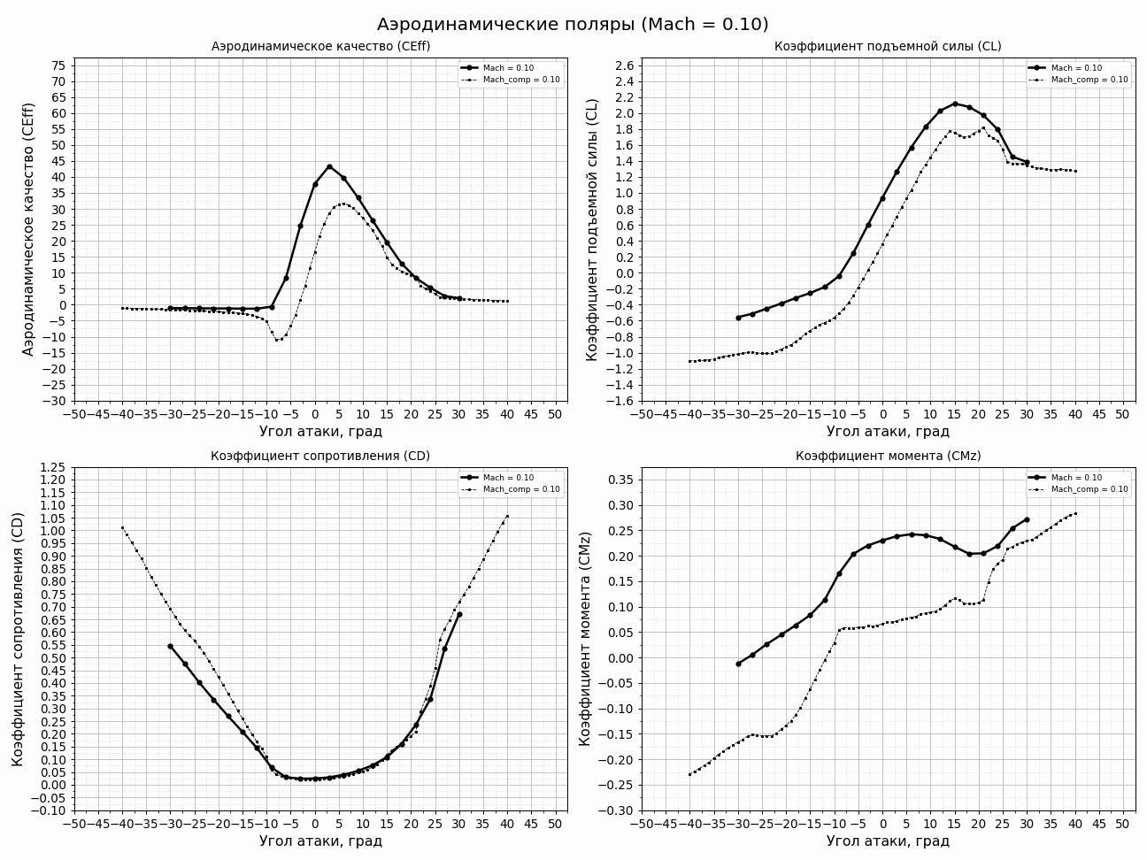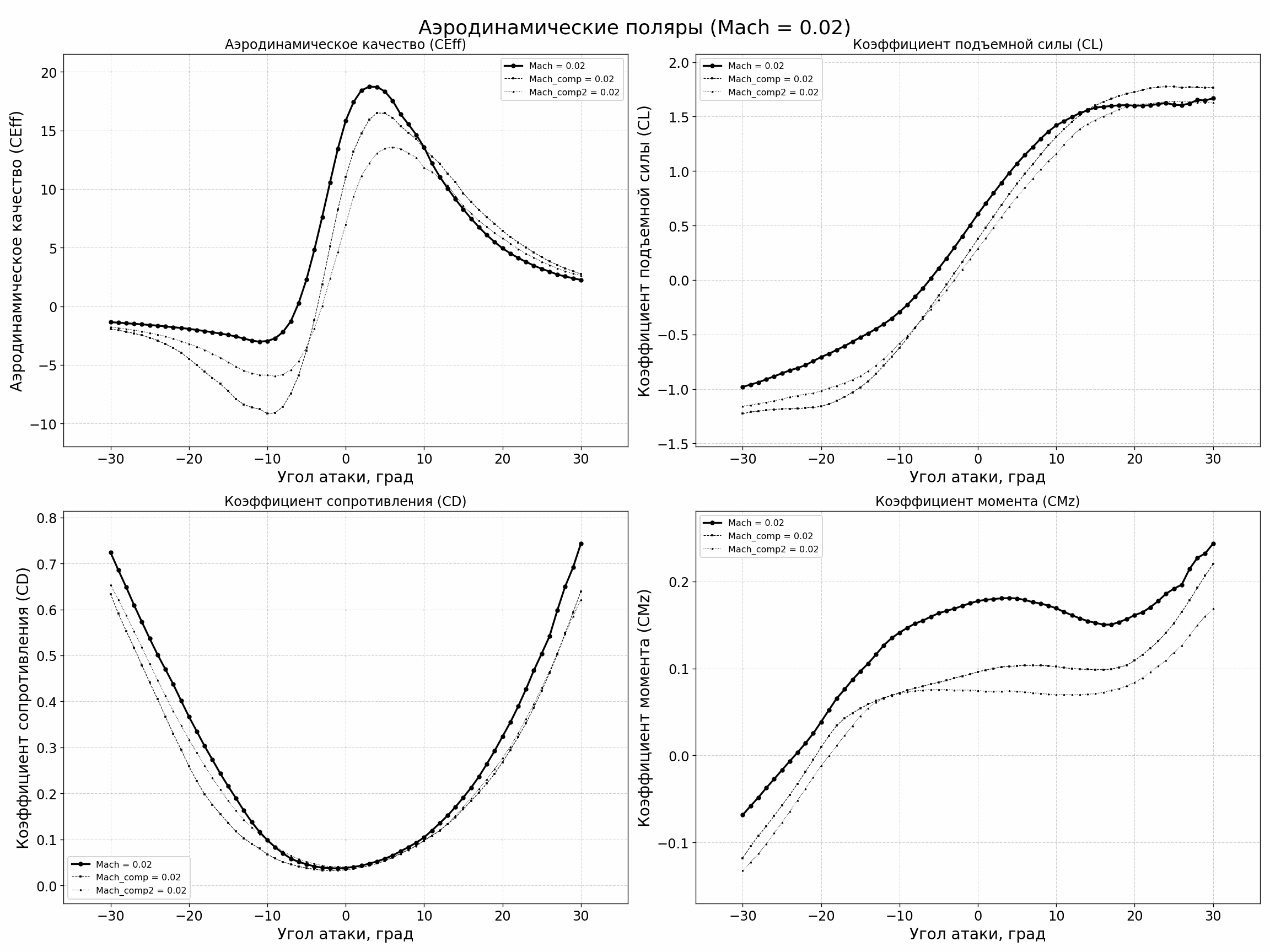 К чему я про эту эпопею? А к тому, что такими тонкими настройками, во-первых, я получил параметры мешера, при которых проверенный по надёжности расчёт выдаёт максимум (минимум) RMS_DENSITY и, одновременно, получил максимально быструю и надёжную сходимость. Возможно, не зная, какие цифры выйдут при натурном испытании, но я выжал максимум надёжности из своих расчётов. Поляры от старого расчёта из баттла в фоне в сравнительной поляре ниже, все перемены наглядно. Кстати, размер сетки упал до 600 Кб.