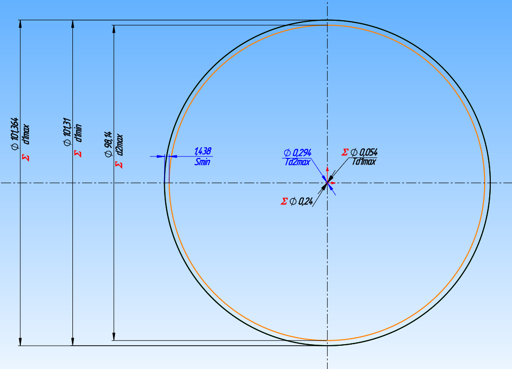 В вашем случае максимальный допуск соосности складывается из максимального допуска на размер Ф98H10 - 0,14 мм + допуск соосности 0,1 мм (в диаметральном выражении) + максимальный допуск на размер базового диаметра Ф101,4f8 - 0,054 мм. Поэтому, согласно вычислениям, минимальное значение толщины стенки: [ 101,31 - (98,14 +0,14+0,1+0,054) ] / 2 = 1,438 мм
