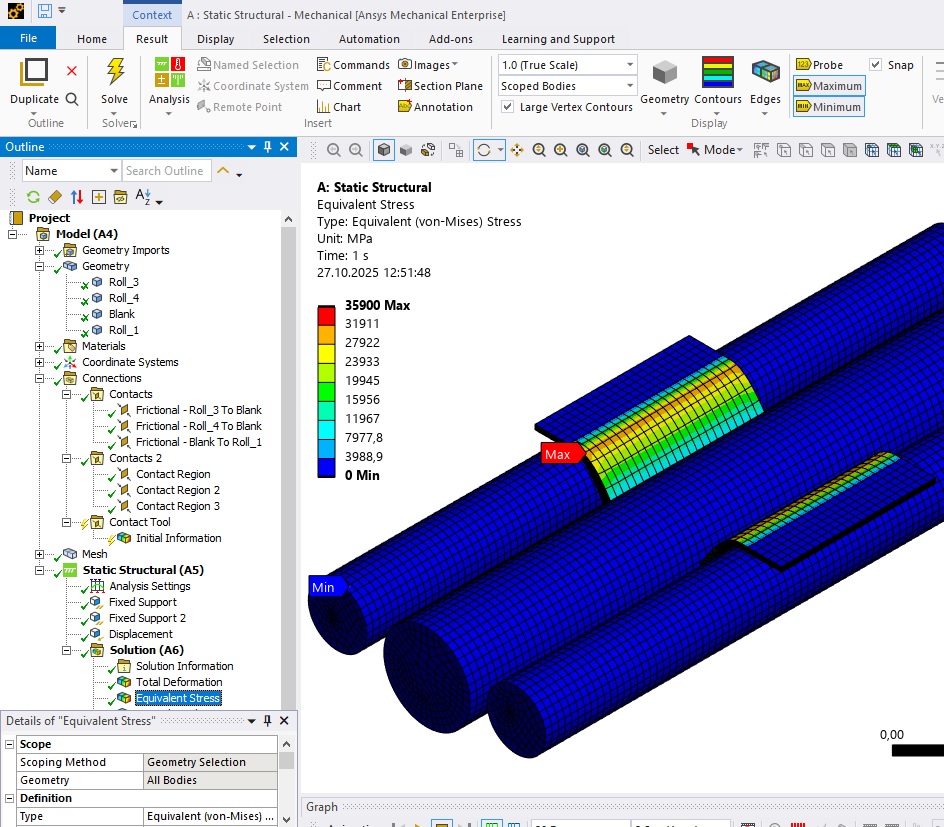 В Ansys 2025 R1 как сделать, чтобы при перемещении на заготовку центрального валка два края заготовки скользили по двум неподвижным валкам и образовывали две вертикальные стенки U-образной детали?