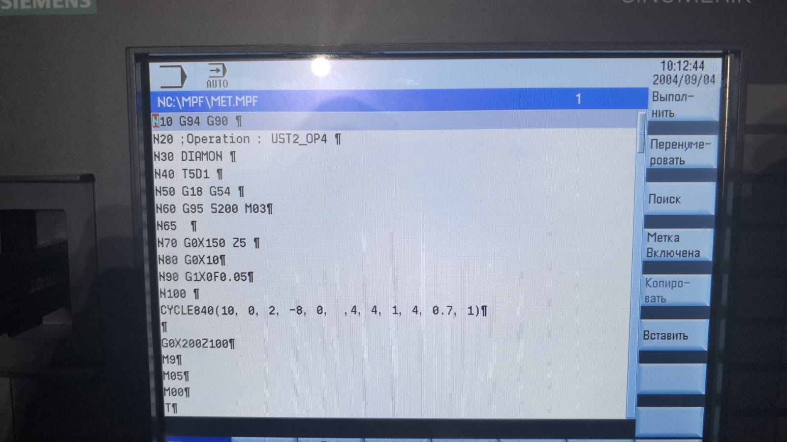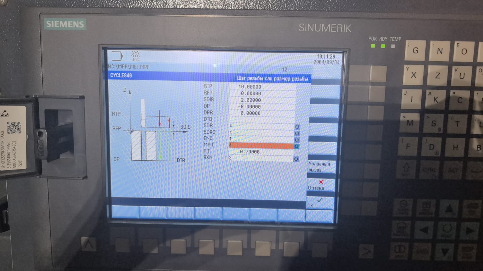 Добрый день. На токарном станке с системой Sinumerik 808D прописываем цикл нарезания резьбы метчиком с компенсирующим патроном, но вместо резьбы метчик нарезает отверстие. Приложил скрины. Помогите разобраться какие из параметров мы некорректно вводим.