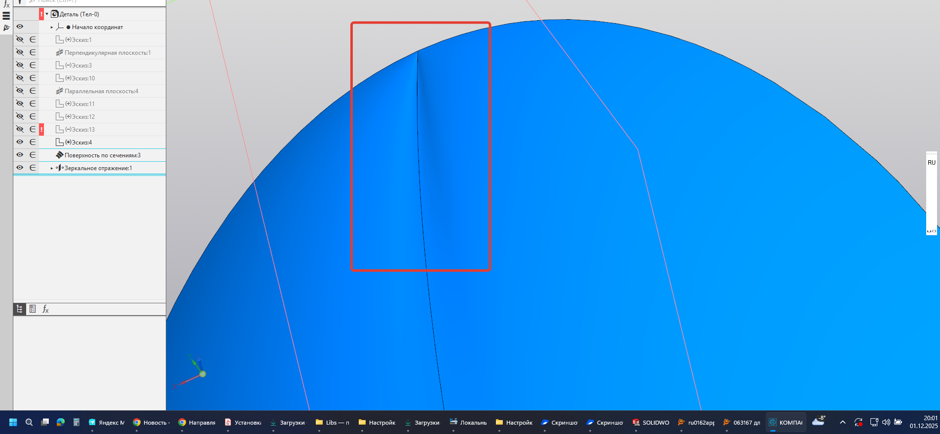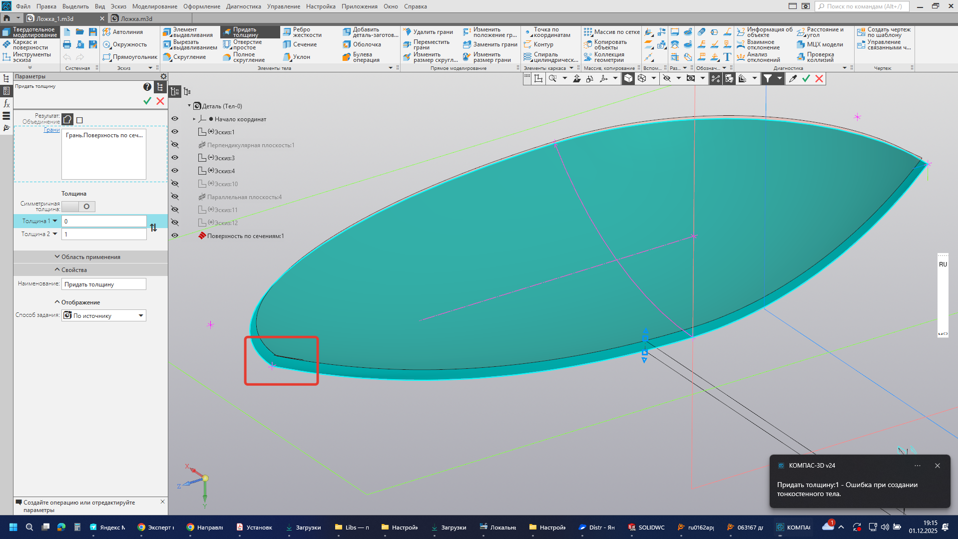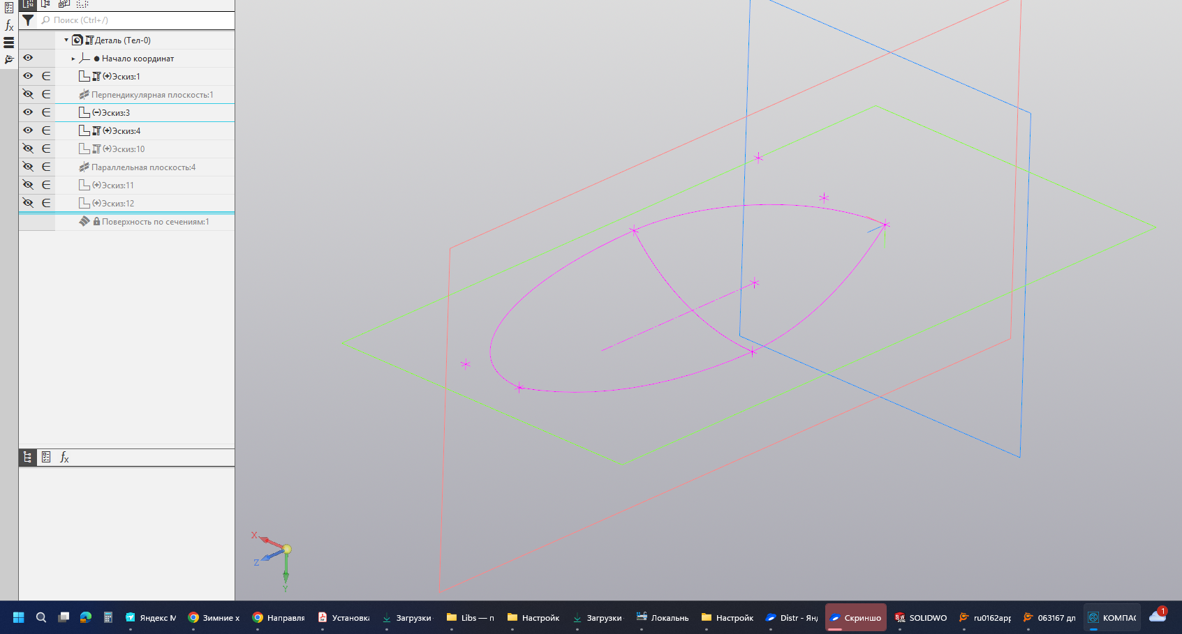 Всем привет. Пытаюсь натянуть поверхность "по сечениям" аля ложка. Строю половинку. Эскиз продольного сечения (в плоскости симметрии) - две сопряжённые дуги. Эскиз на виде сверху (верхняя кромка ложки) - 2 сопряжённые четвертинки эллипса. Эскиз поперечного сечения - дуга.