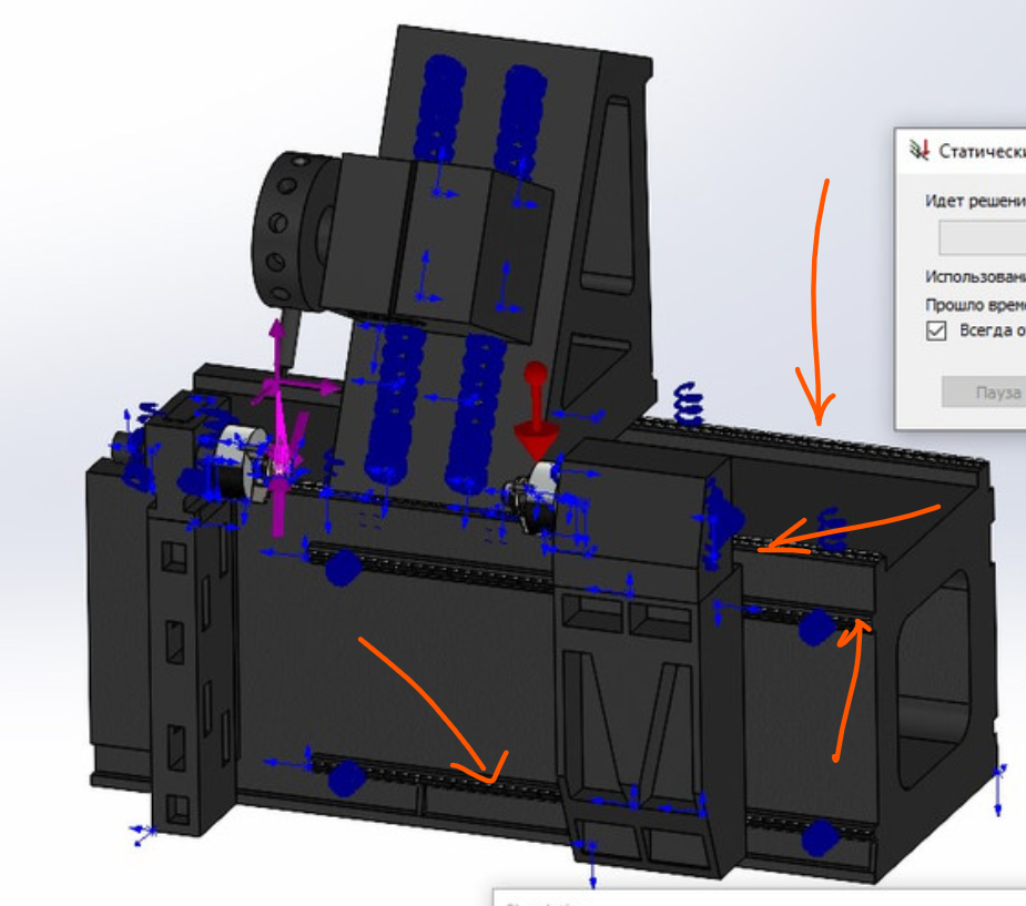 Доброго времени суток. Занимаюсь курсовым проектом на тему проектирования автоматизированного токарного станка с ЧПУ. Столкнулся с такой проблемой, в статическом исследование при попытке моделирования вылезает ошибка "Внутреняя ошибка" и ссылается базу знаний QA00000121977. Происходит это, после того как я назначаю: жесткие связи - пружина - цилиндрическая поверхность (для подшипников в шпиндельном и противошпиндельном узле). До этого момента я назначал через пружины связи для направляющих и танкеток, при запуске моделирование работает, только за счёт отсутствия жесткости подшипников, шпиндельный вал вылетает из коробки. В общем и целом хотел бы услышать ваши советы, о том как можно исправить эту ошибку.