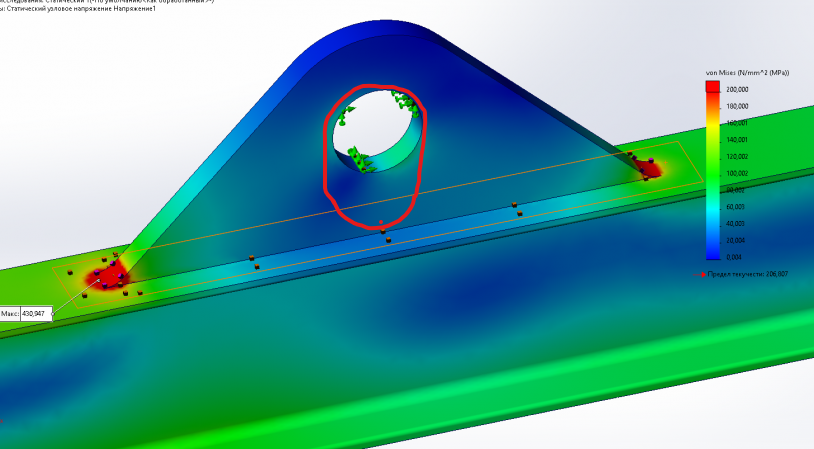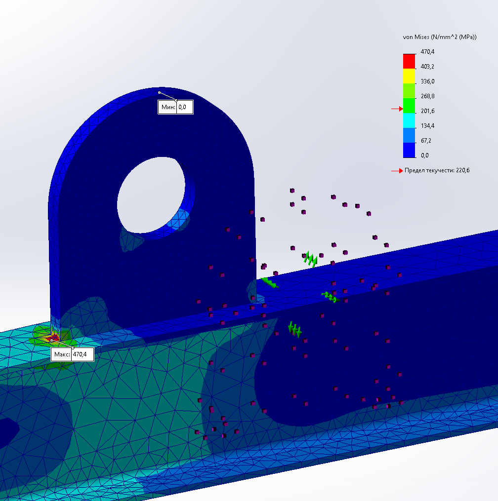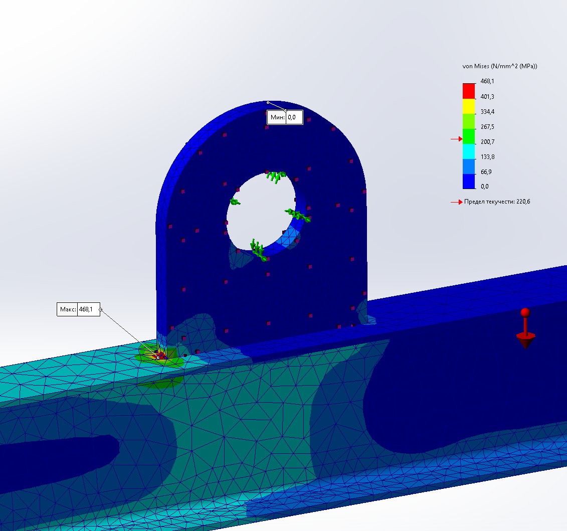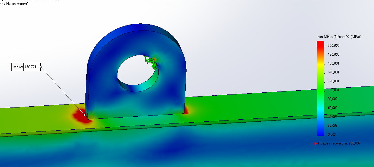 Вот я вижу локально в этих точках напряжение 350-400 мпа, предел текучести 200 мпа, предел прочности 500мпа. Перемещение 0.1мм в этих местах. какой вывод можно сделать? проушина вытянется вверх или вдоль стропа, который за неё зацепляется? но ведь вдоль стыка проушины и балки низкое напряжение и перемещение показывает 0.1 везде, значит будет на месте. отломается? до предела прочности значения не дошли.