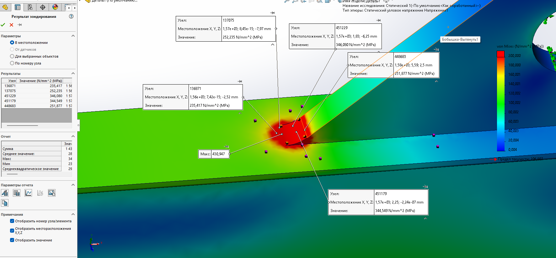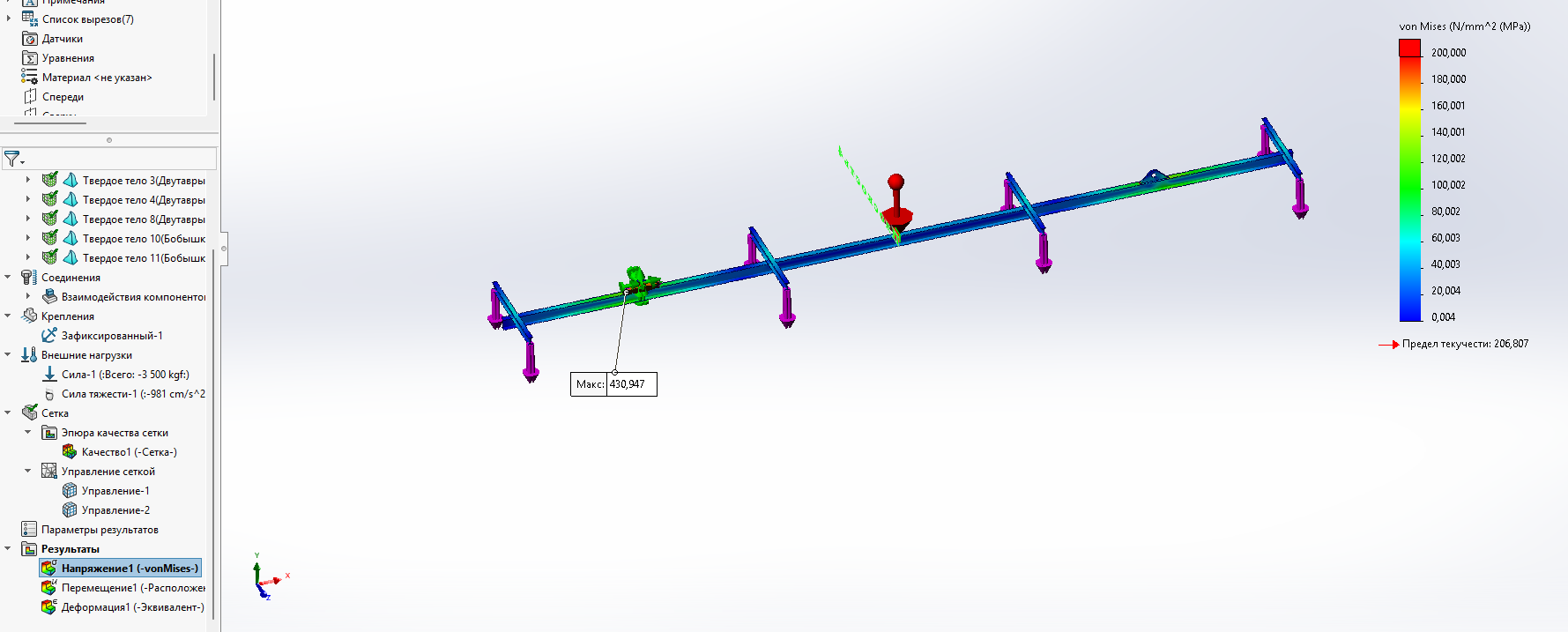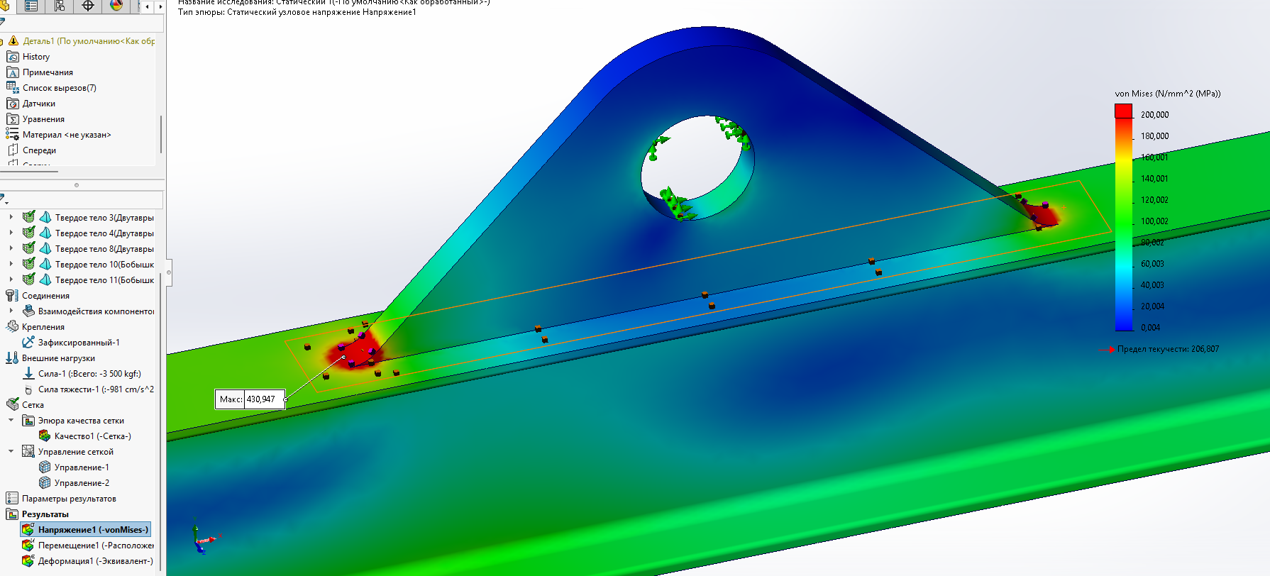 Вот я вижу локально в этих точках напряжение 350-400 мпа, предел текучести 200 мпа, предел прочности 500мпа. Перемещение 0.1мм в этих местах. какой вывод можно сделать? проушина вытянется вверх или вдоль стропа, который за неё зацепляется? но ведь вдоль стыка проушины и балки низкое напряжение и перемещение показывает 0.1 везде, значит будет на месте. отломается? до предела прочности значения не дошли.