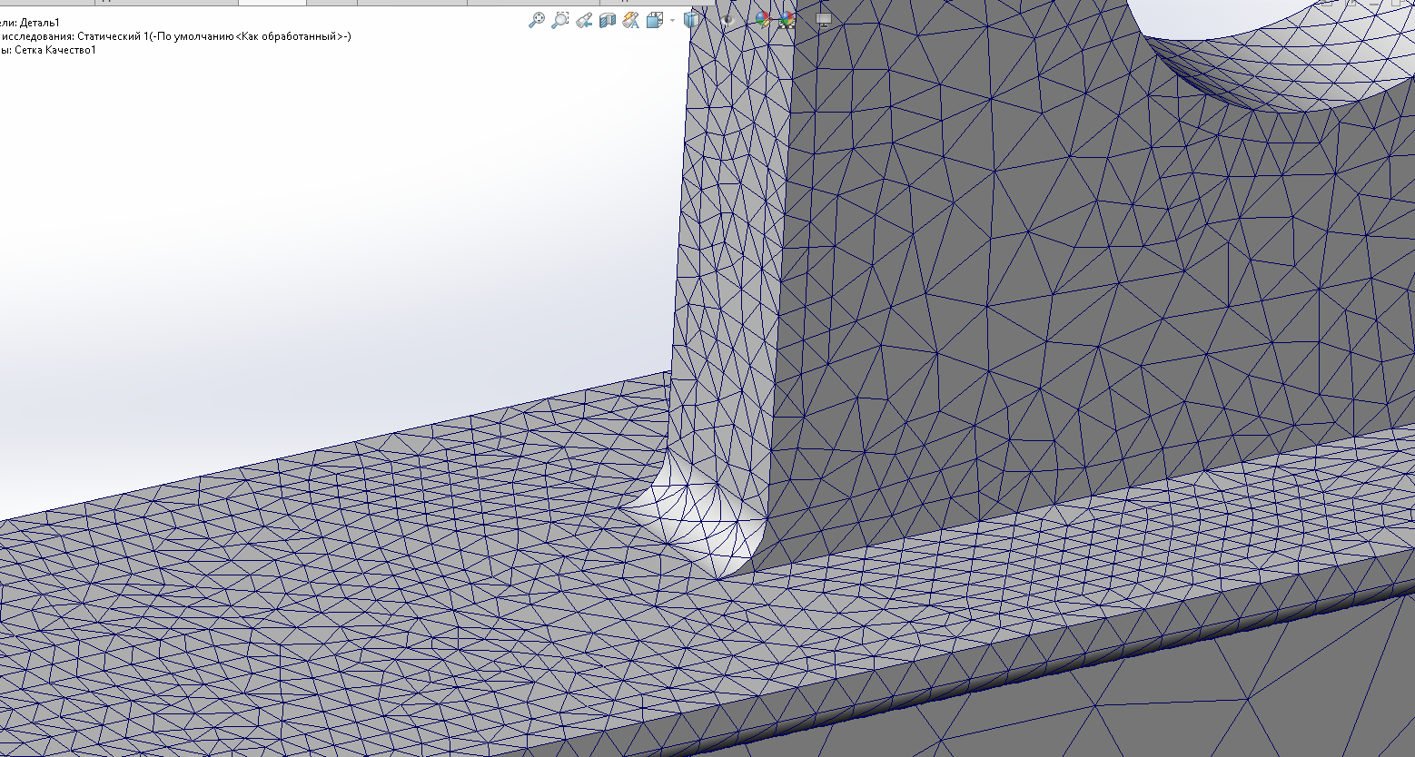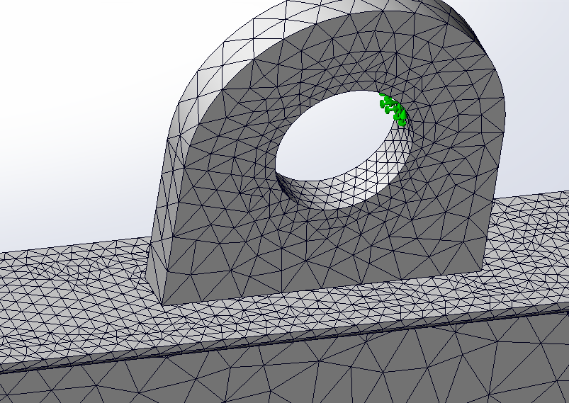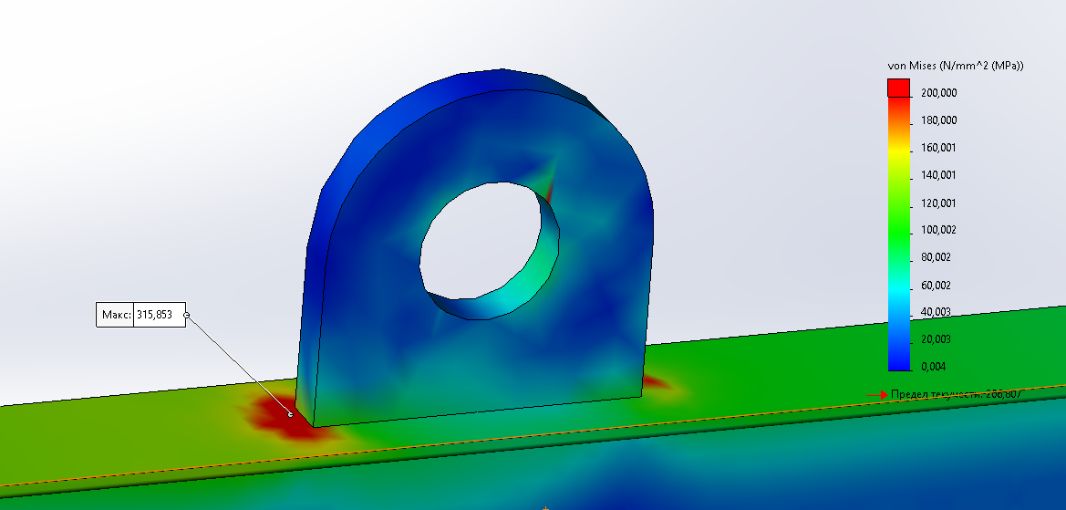 пробовал менять радиус скругления в этом месте, мельчил сетку, ставил рёбра жесткости к проушине, результат не меняется. Мне кажется, солид врёт в этом месте.