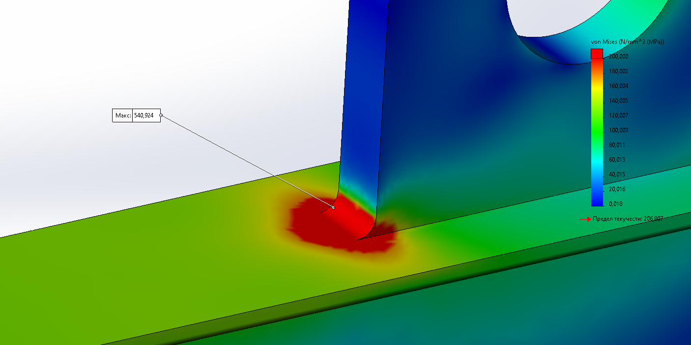 теперь ваша задача как инженера понять, насколько превышение напряжений в такой небольшой зоне является опасным с точки зрения прочности всей конструкции.