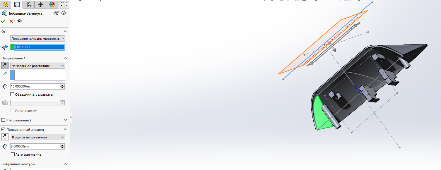 Я пытался все вариации, в том числе до тела, но как ни пытаюсь выбрать тело козырька он называет это бобышка вытянуть 18, а это отдельная бобышка элемент