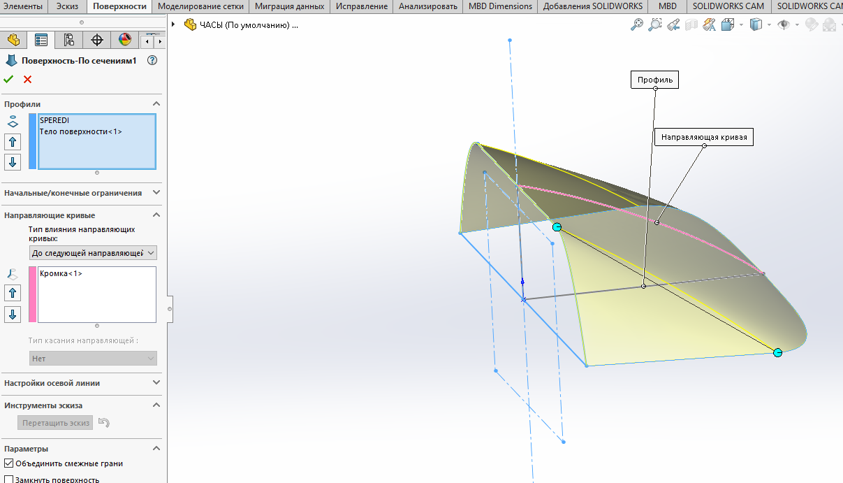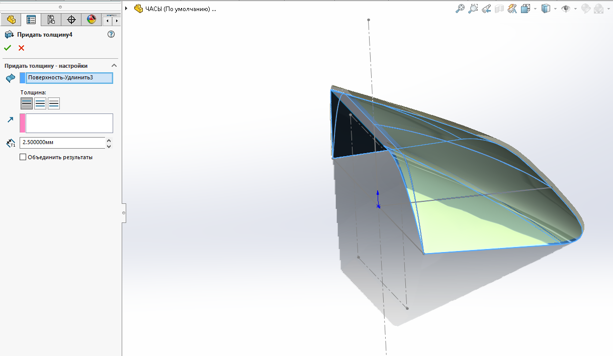 И еще козырек построен - поверхность по сечениям, что может быть с ней не так, что придание толщины у этой поверхности работает только наружу, но не хочет внутрь и в обе стороны?