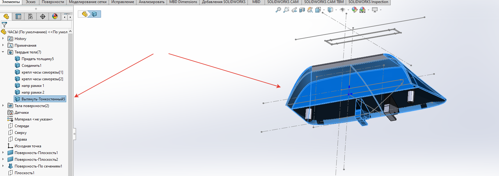 Но вообще корпуса лучше проектировать наоборот. Сначала строишь единое тело, потом режешь его на отдельные тела. А потом сохраняешь эту многотельную деталь как сборку.