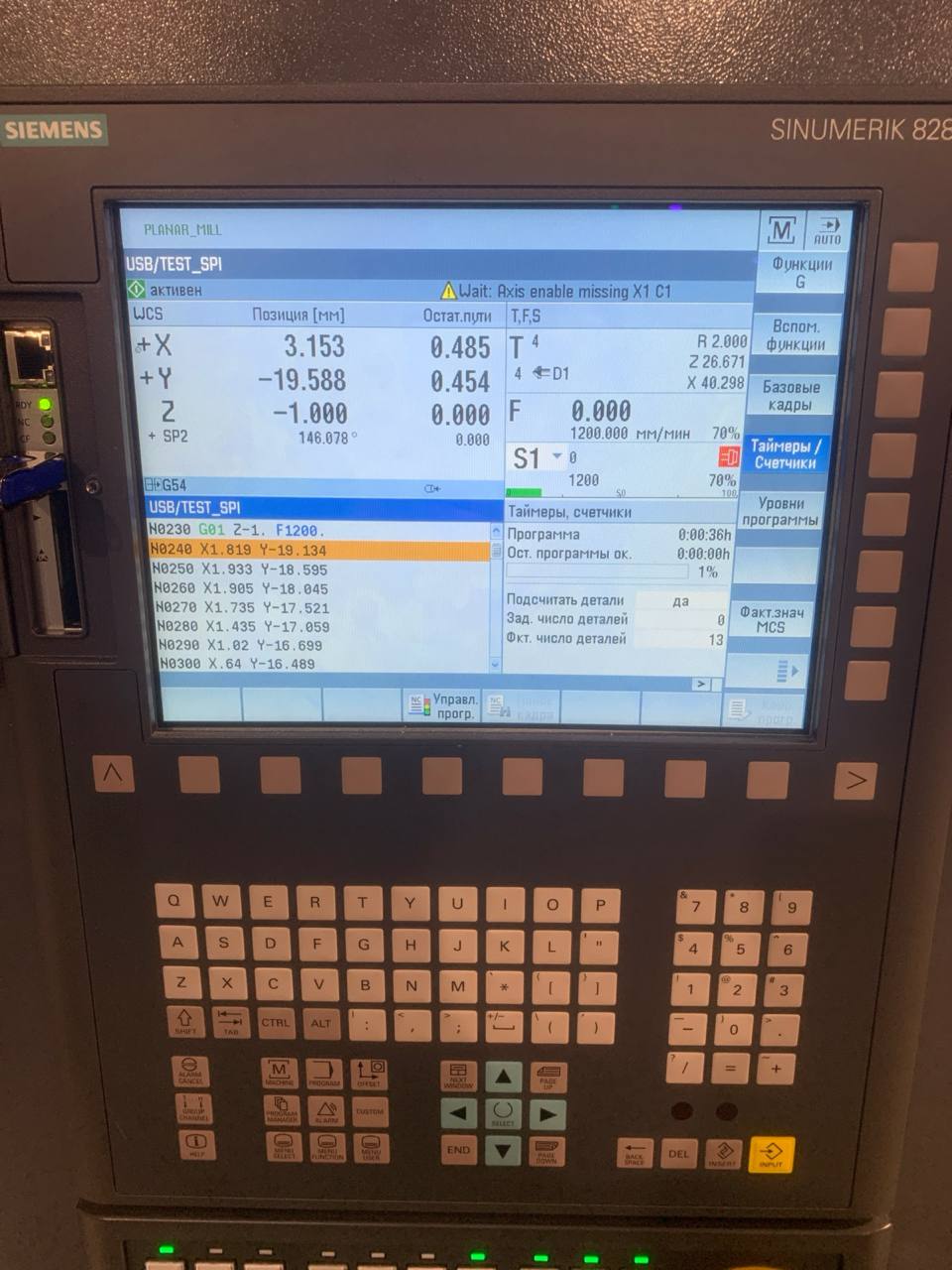 Прикрепляю фото стойки с жёлтым треугольником (axis enable missing X1 C1) если правильно понял то это запрет на движение осей X1 и C1. Но TRANSMIT это координаты X Y(виртуальная)