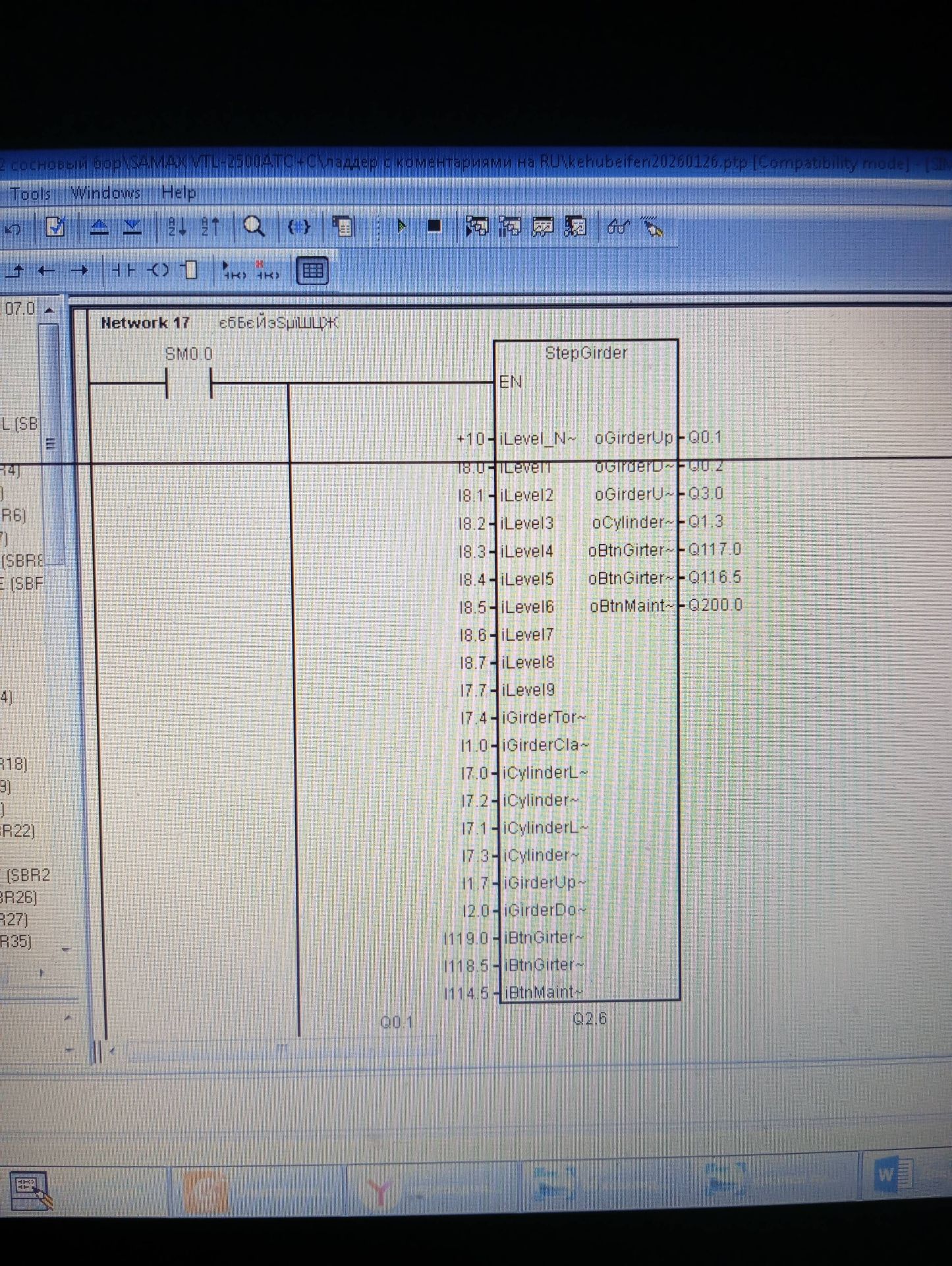 Да он. Я смотрел. Допустим вход I119.0. Это кнопка на пульте подъема траверсы вверх. Его(этого входа) нет в подпрограмме StepGirder. Это блок у меня SBR47. Правильно я же понимаю. Подпрограмма это какой то блок?