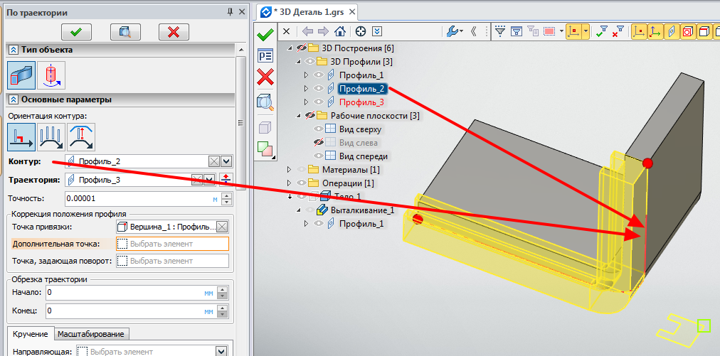 В итоге у Вас появится траектория в виде профиля по которому будет строится тело.
