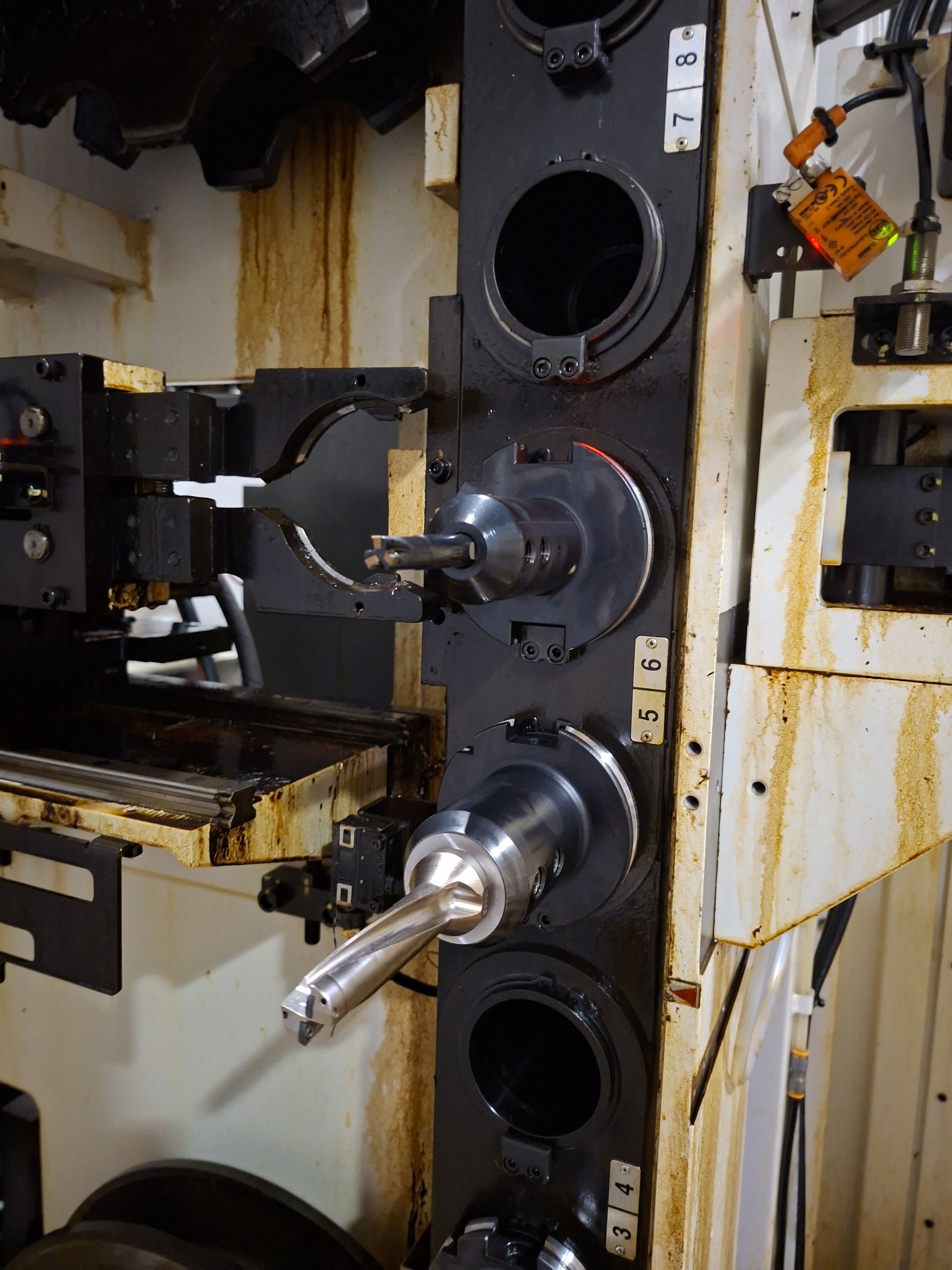 Магазин сбивался в начале смены. Мы восстанавливали его положение следующей процедурой. устанавливали его вручную в нулевое положение, далее нажимали кнопку выхода в референты и вращение магазина на одну поз. По факту магазин не вращался, индикатор принимал значение 1 (корректное), далее перезагружали станок и работали смену без проблем.