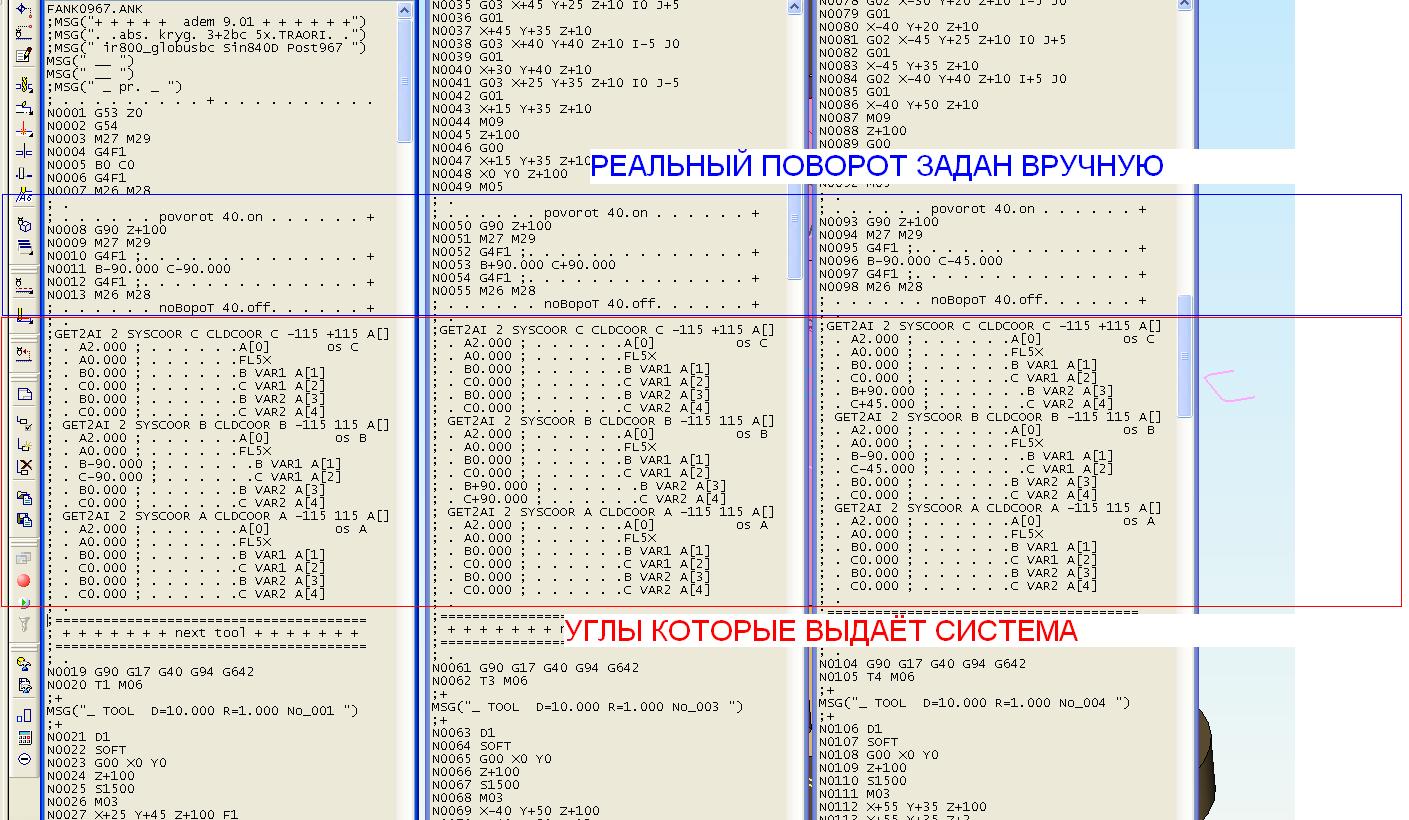 Пока что больше всего не хватает информации. Не знаете алгоритм 10123 принудительно активировать можно ? Чтобы можно было через DATAV C CLDCOOR SYSCOOR получить углы проекций осей системы координат кэ в алгоритме 406 трансформа зоны обработки. А то у меня углы все нулевые получились по 10123. То есть он автоматом в 406 не срабатывает.